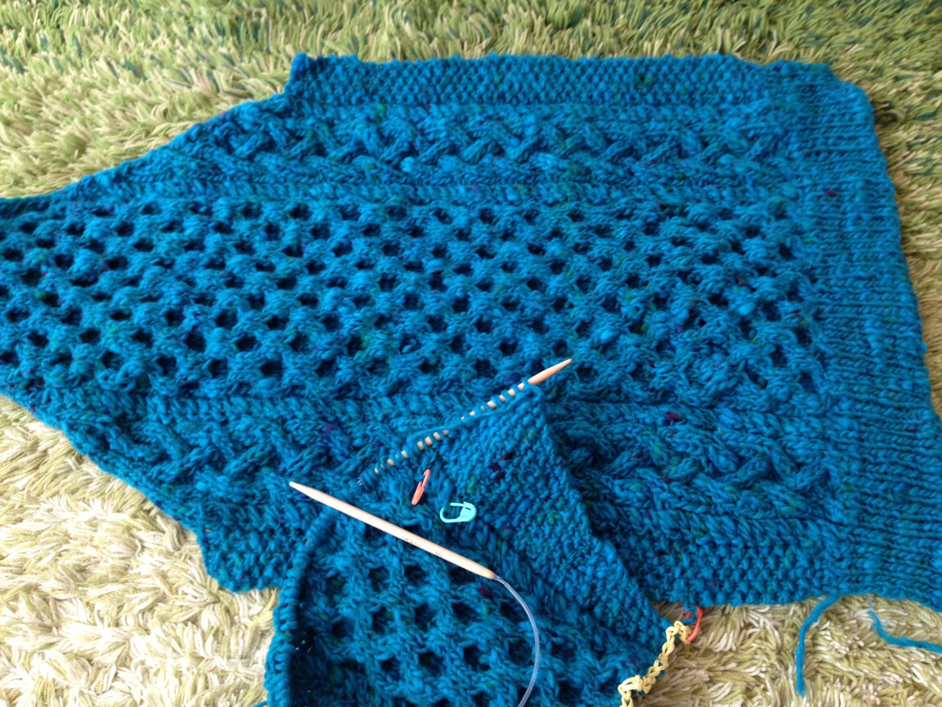 後ろ身ごろが編み終わり、右袖が半分編めたところ。