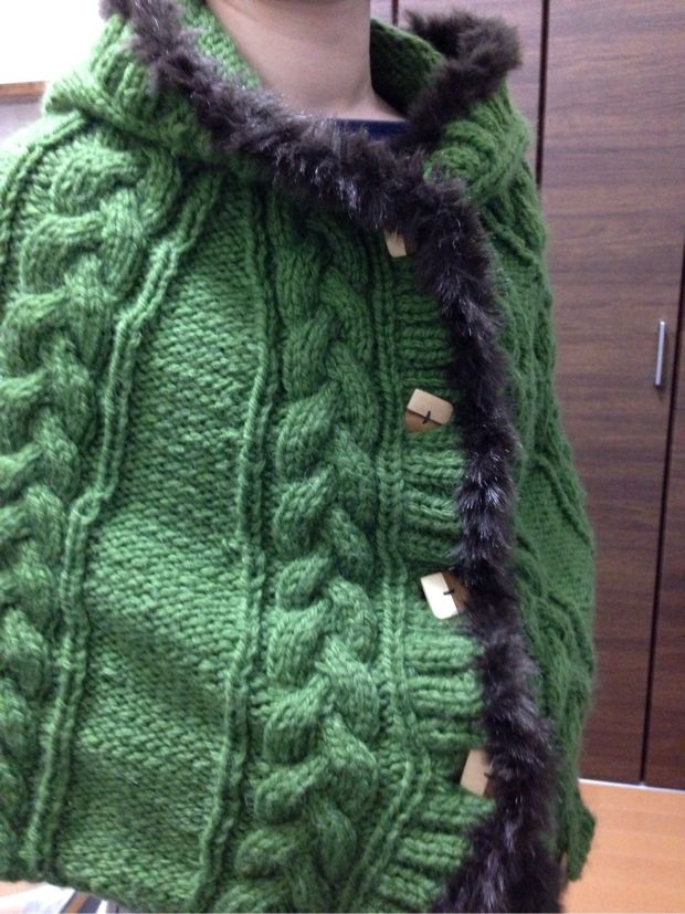 「おでかけニットvol.1」のフード付きポンチョを緑色でファーを付けて編んでみました^_^