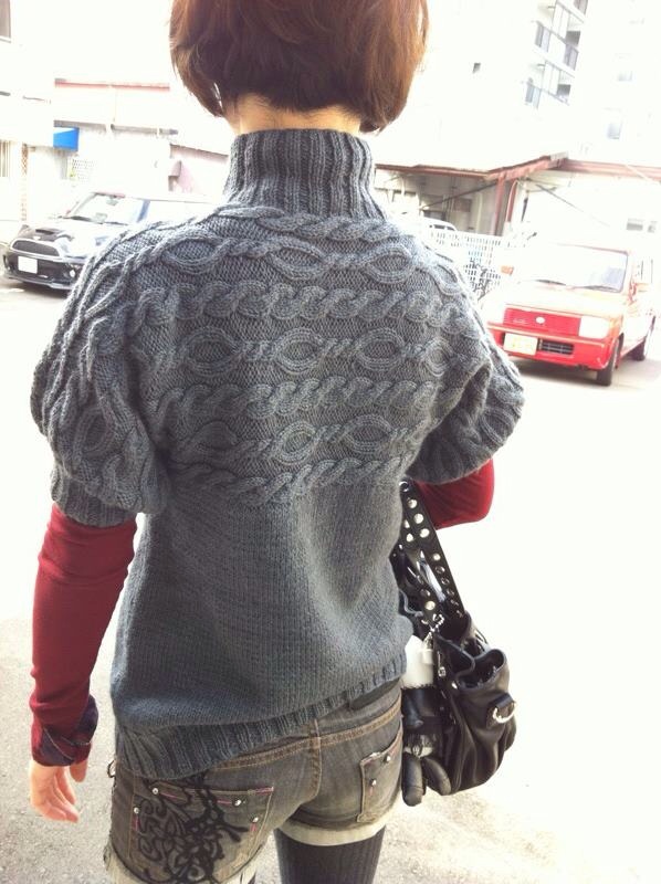 一度、水通しをして着てみましたがパフスリーブのお袖がすっごく、かわい~~~~♪  動きやすくて、お気に入りの一枚になりました。色違いでもう一枚編みたいと思っていたら、母から「ソレ頂戴♪」  と催促されてしまいました。   私の記念すべきセーター1号なので、どんなにせびられても上げたくない~~~~~