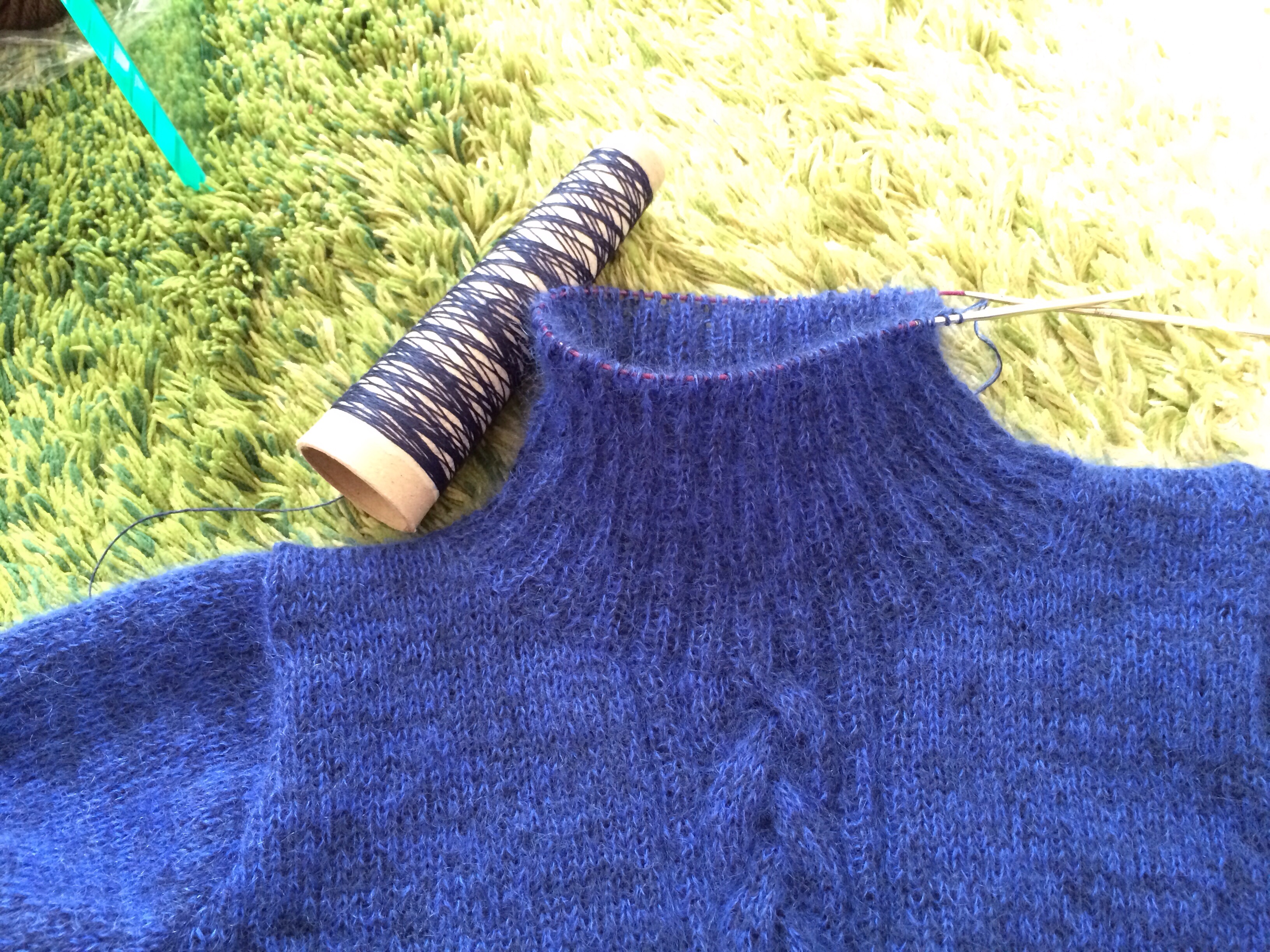 ★衿は普通のフセ止めにしましたが、オフタートルのデザインなので伸縮性のある伏せ目にしたかったため、ツリが気になったのでElastic Bind-offで伏せ目をしなおしました。