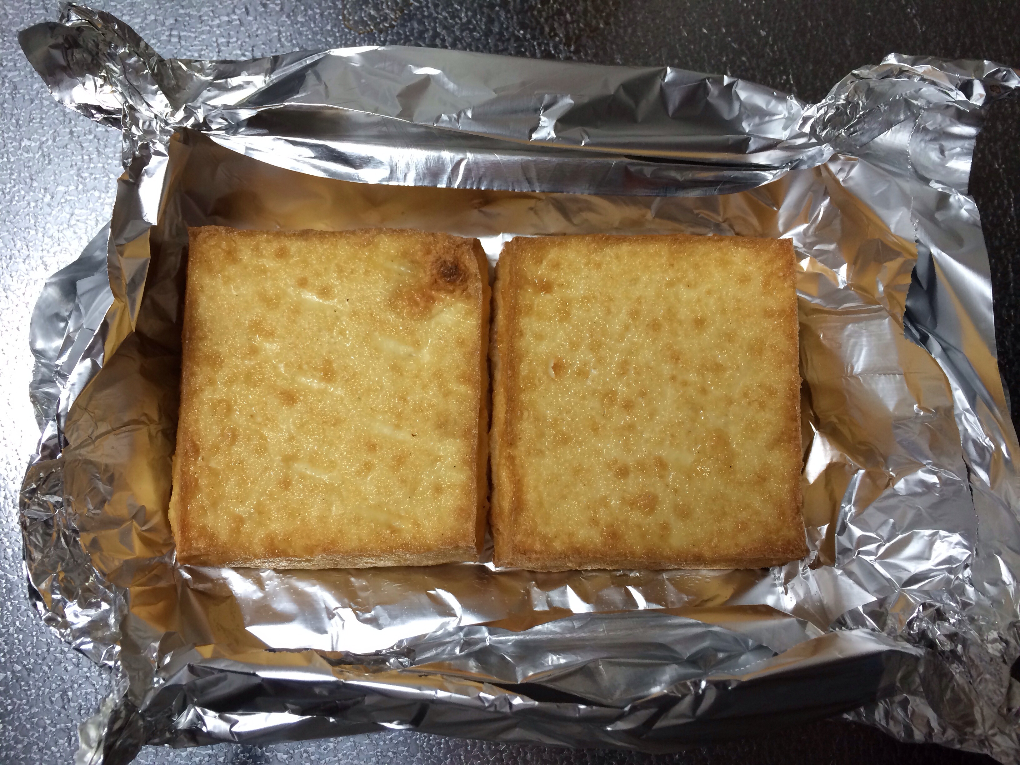 ★2枚重ねにしたアルミホイルに厚揚げを乗せて、厚揚げの水分がこぼれないように四隅をねじりましょう。