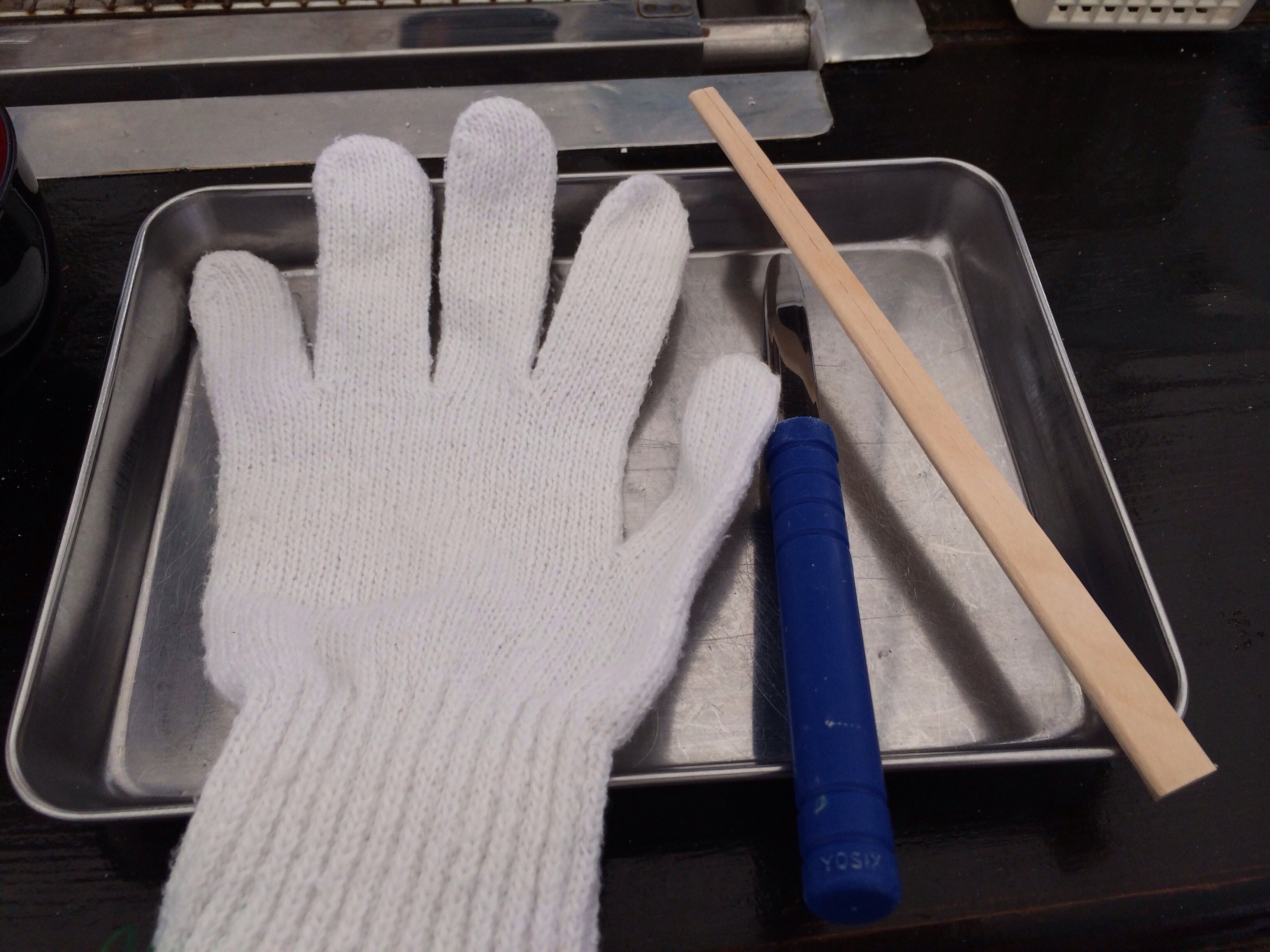 席に座ると、トレー、軍手と牡蠣を開けるナイフが置かれます。