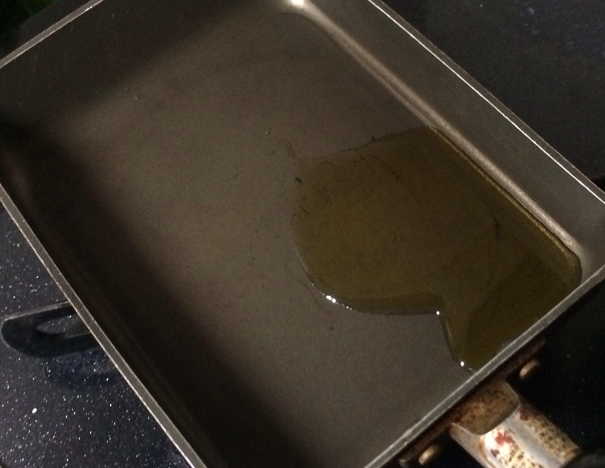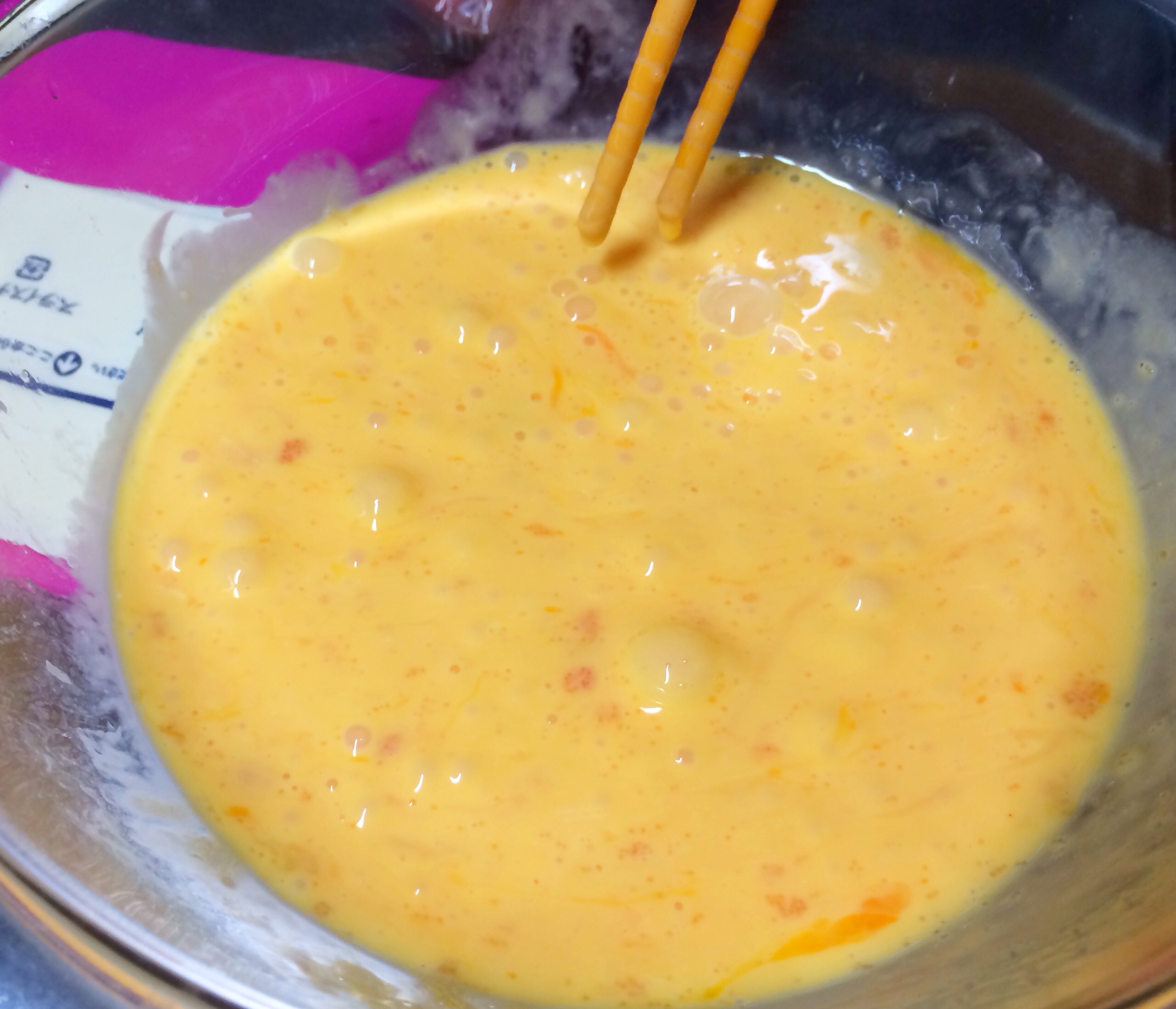 ①大さじ1〜1.5くらいの油を入れて、中火だ熱し卵液のついた菜ばしを入れるとパチパチはぜる位になれば焼きはじめます。