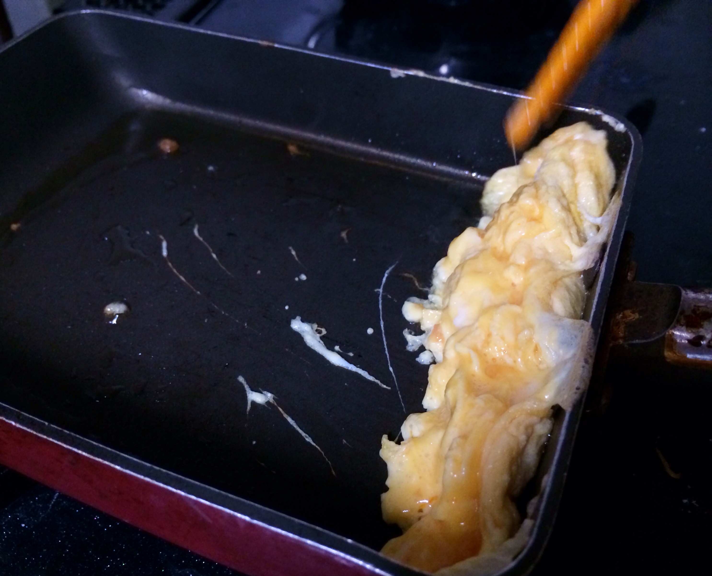 ②卵焼きパンに少しだけ卵液を入れてぐしゃぐしゃとかき混ぜながらパンの隅に固めて芯を作ります。