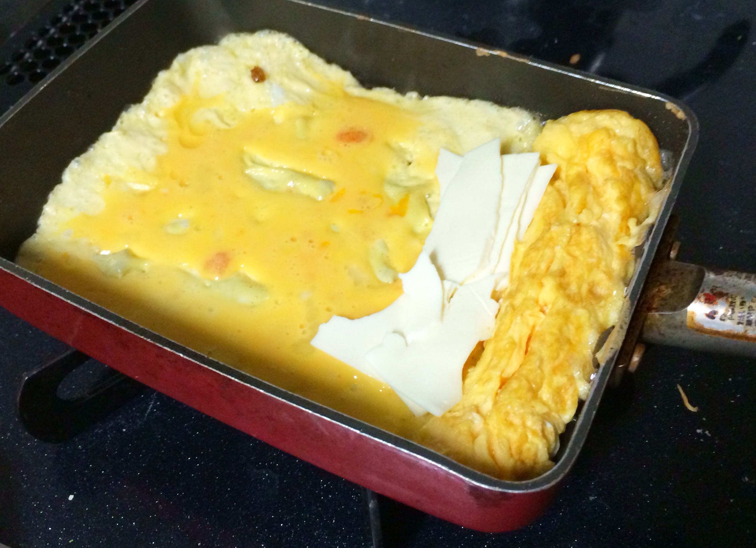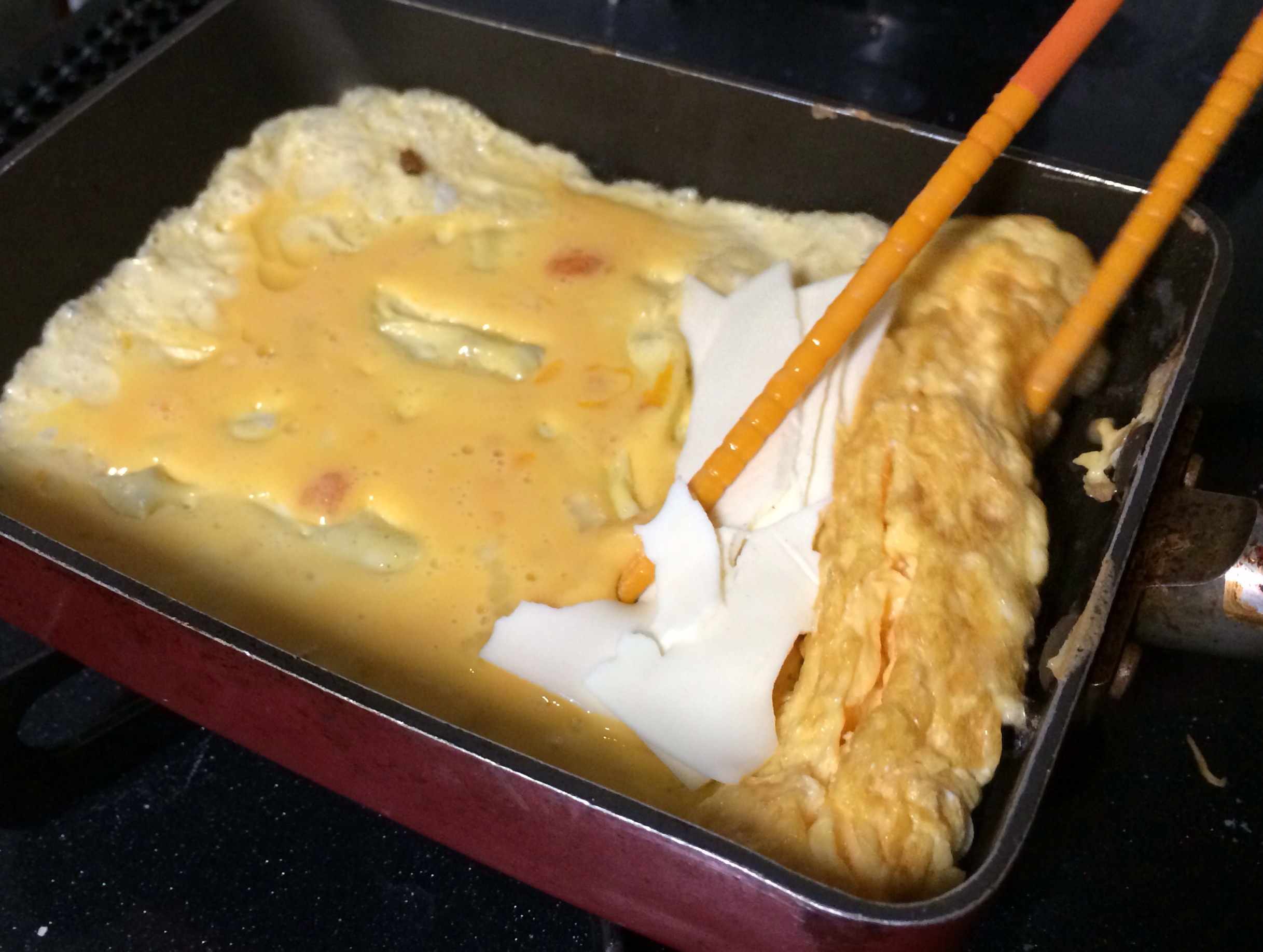 1投目.卵液を流して4ツに折ったスライスチーズを乗せて、チーズを置いた部分をあまり触らないようにフンワリ巻きます。