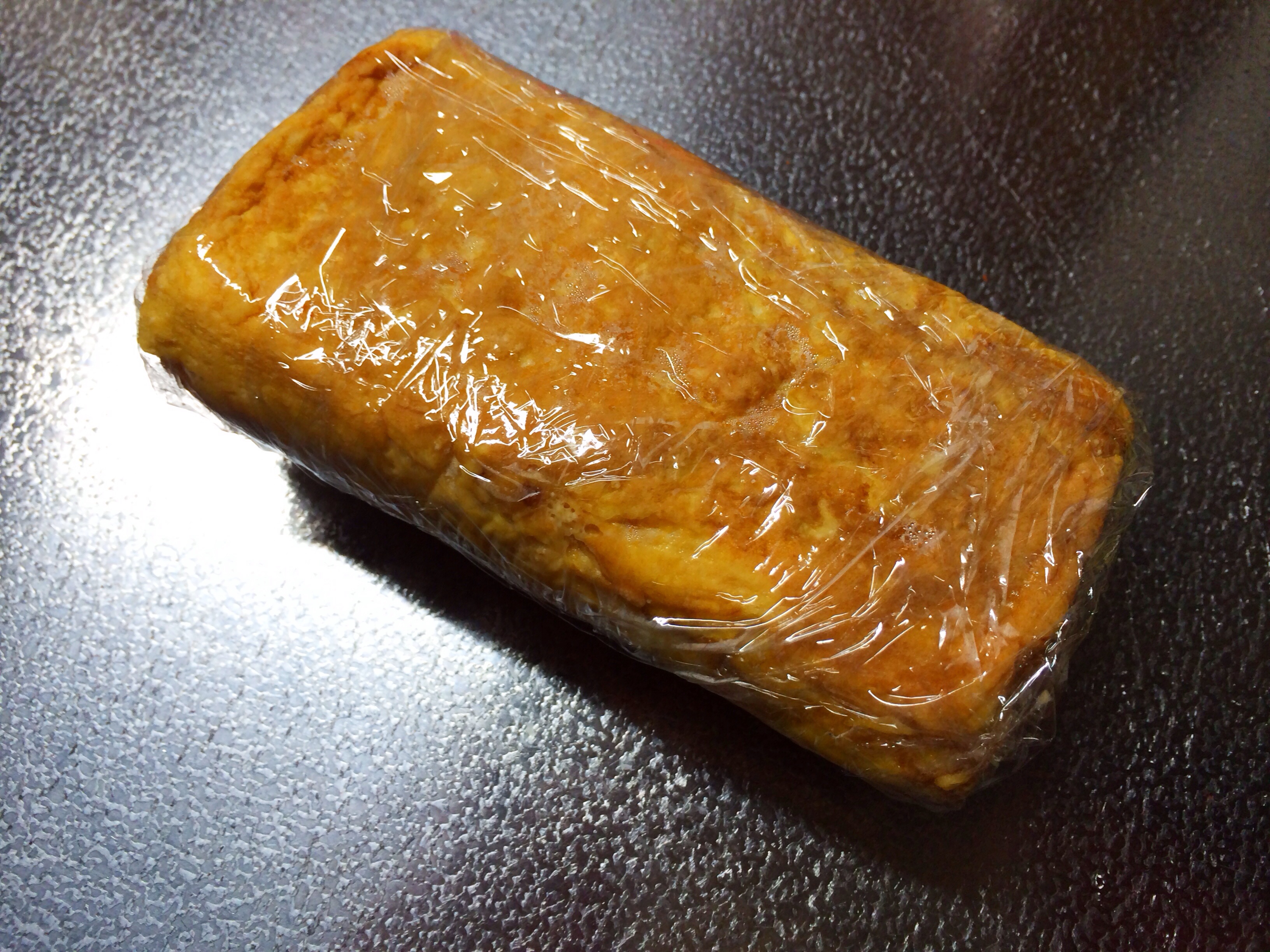 卵液がなくなるまで繰り返し、焼きあがったらしっかりと形を整えるようにラップでくるんで10〜15分休ませます。型崩れ防止とパサつき防止になります。