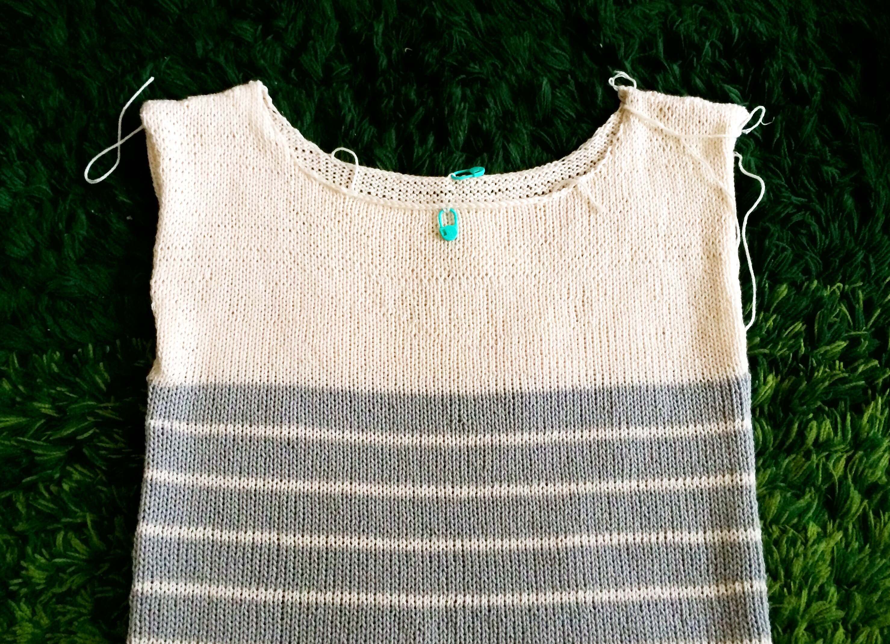 肩下がりを少しつけたかったので、3分割してgerman short rowsで編んでいます。