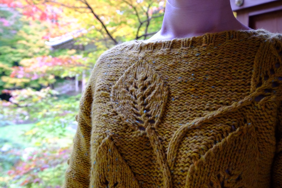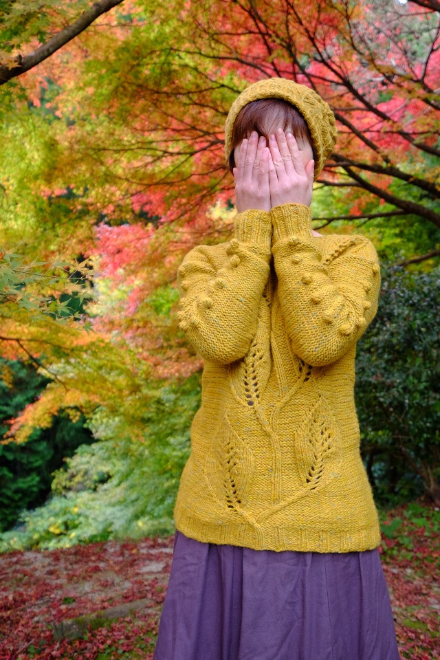 今回のニットは真っ黄色で町中では浮き立つ色ですが、ド派手な紅葉の中では保護色になるというミラクルがおきます(笑)