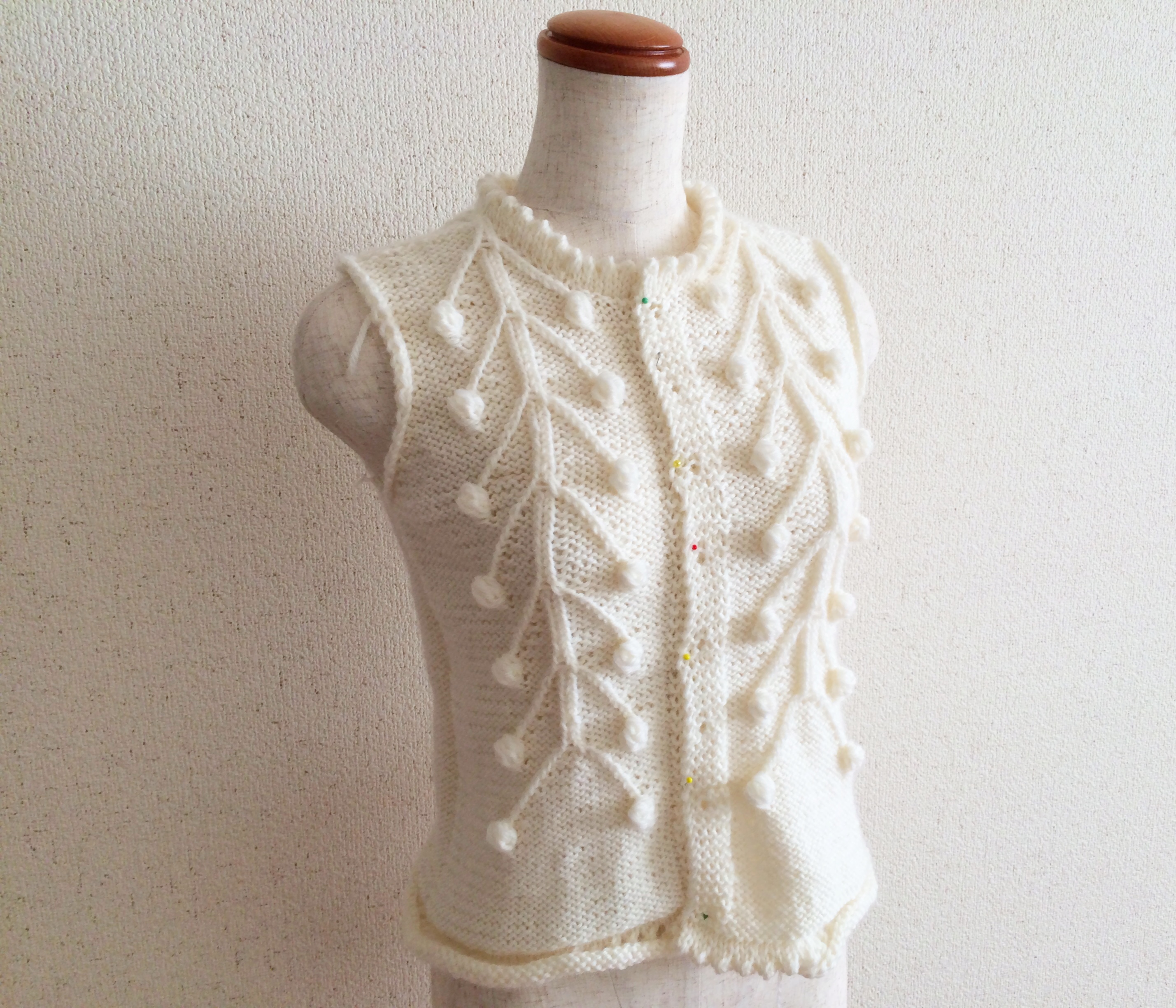 肩下りに編んでいるので形も美しく、衿や裾に編んだピコットは大人可愛さなインパクトがあります。