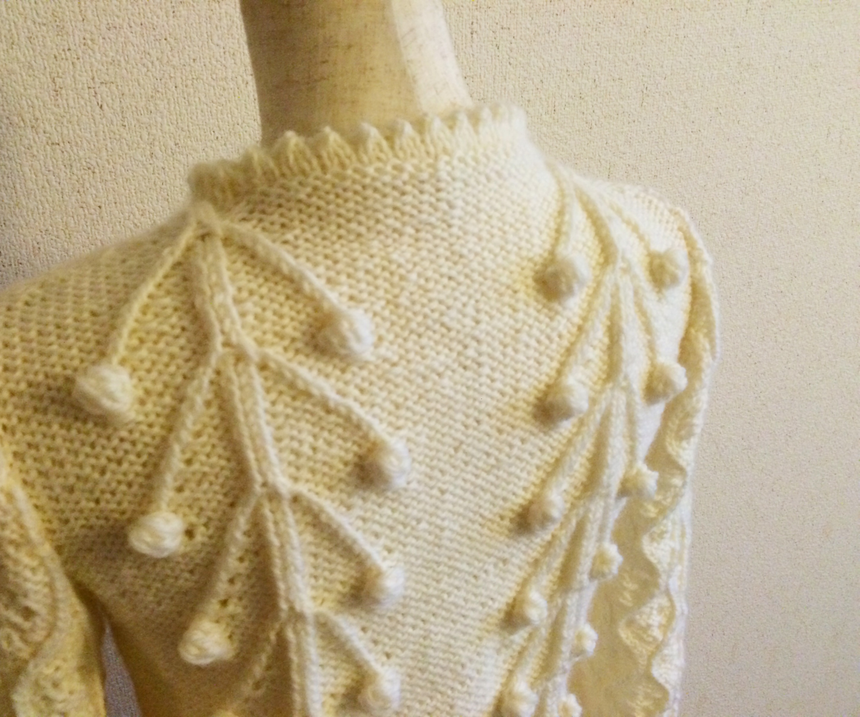 模様編みも玉編みも全て楽しめる、棒編み好きには堪らない魅力がつまった1枚だと思います。