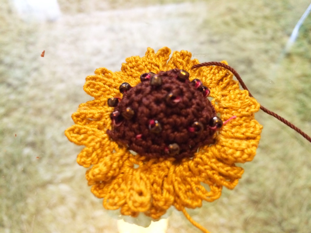 真ん中の花芯を明るいグラデーションで編んで、花びらの色をワントーン明るくしてみようと思います。