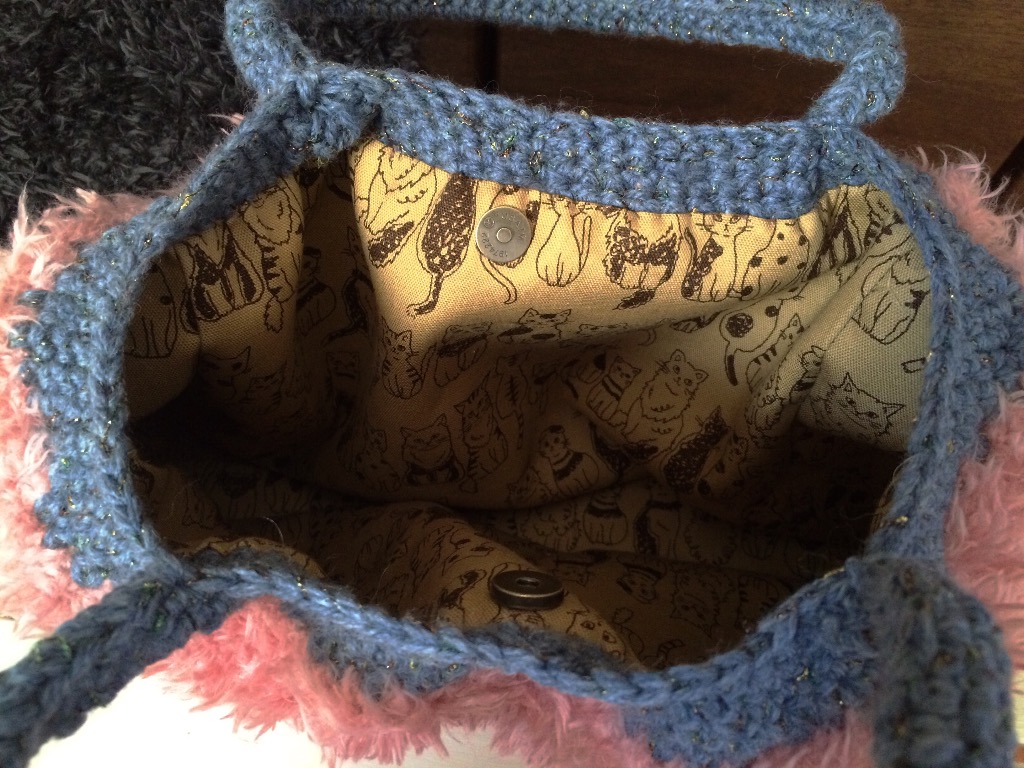 少し前に編み上げていたふもふクラッチバッグに、もふ仲間が増えました♫