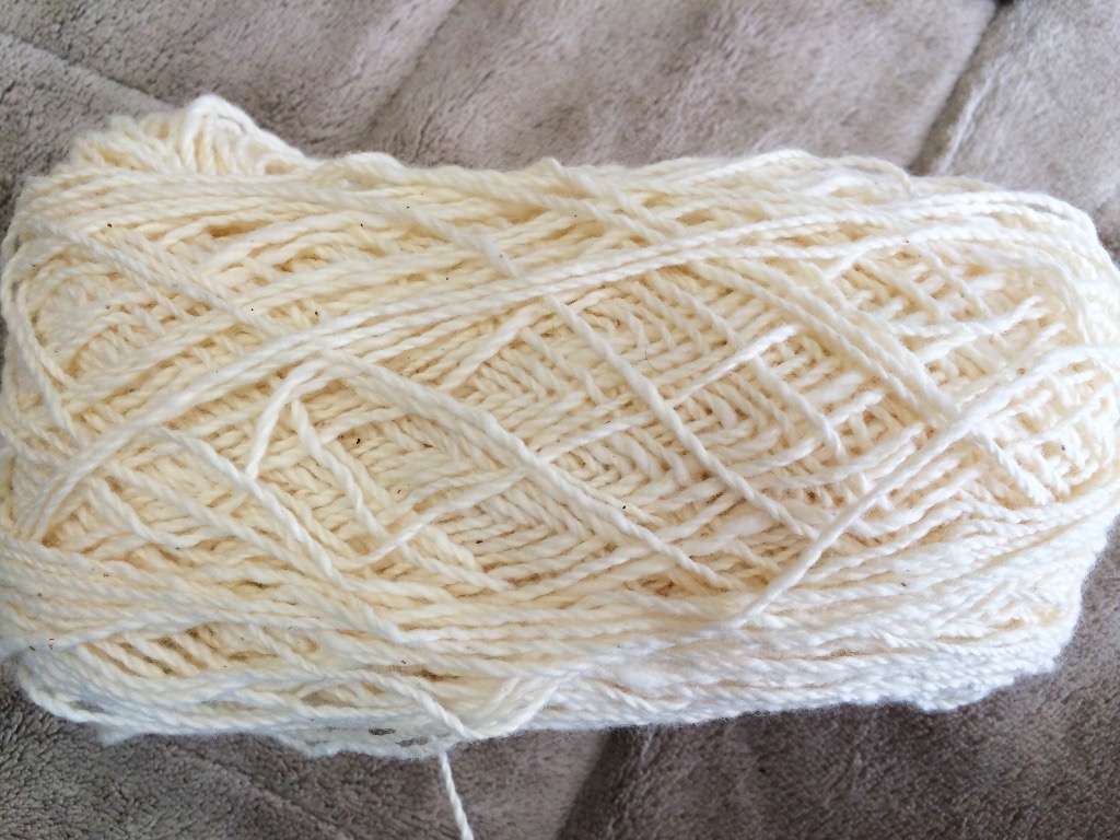 太さは中細あたりで軽くて柔らかい、やや黄味かかったアイボリーカラーのこの糸がぴったり合いました★