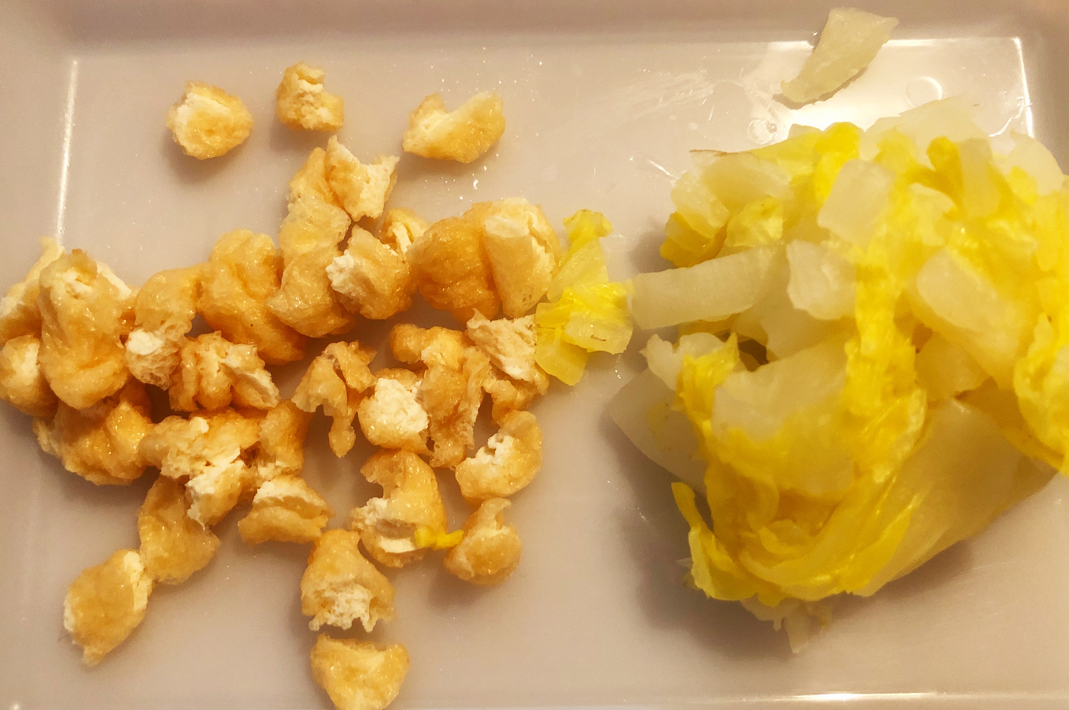 油揚げは四角の一片を5ミリほど切って口を開けてお湯にくぐらせて油抜きする(切り落としたカケラも一緒に)