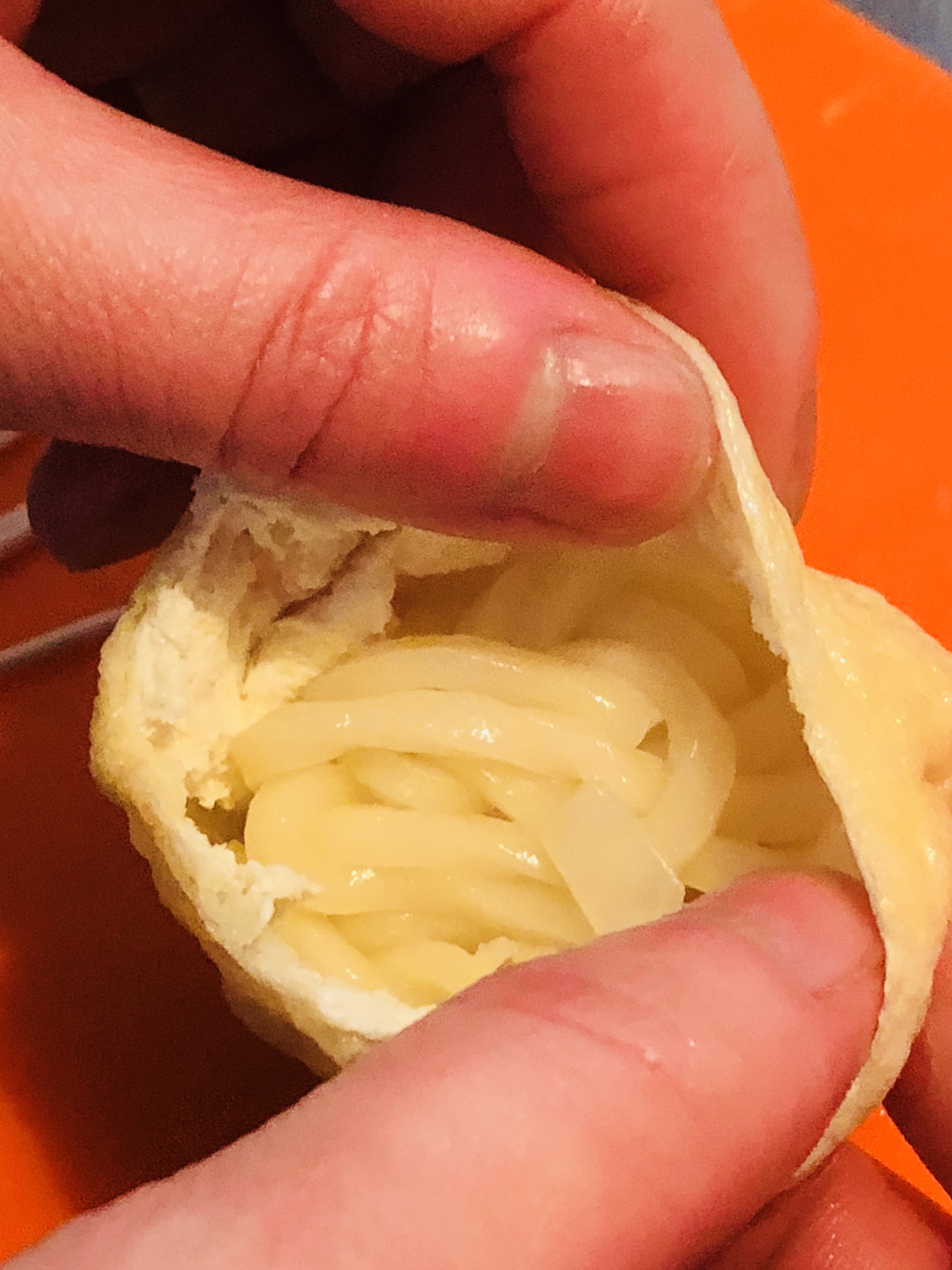 口を開けた揚げに白菜をひとつまみと細切れの揚げを入れうどんを潰さないように入れて楊枝で縫うようにとめる。